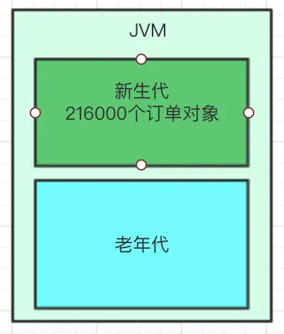 216000个订单对象,越来越多的订单对象存放在JVM中,事实上除了订单对象还会有其他的对象会存在,这个数字还要扩大10-20倍来计算。
