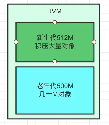 这里我们假设是2kb这样一秒也就消耗240kb内存(120 * 2kb)看起来不大,服务压力还不明显,如果设置新生代为512m(524288kb)那大约要30分钟新生代才会被占满,然后JVM才会去执行Minor GC垃圾回收。