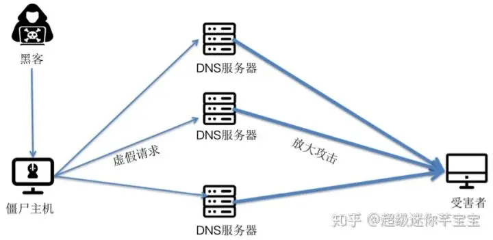 DNS面临着各种各样的网络安全威胁,它一直是网络基础架构中较弱的一环。 我们先来看看DNS服务器的威胁之一:DDoS攻击。DDoS攻击,即分布式拒绝服务攻击,攻击者通过控制大量的傀儡机,对目标主机发起洪水攻击,造成服务器瘫痪。 DDoS攻击通常分为流量型攻击和应用型攻击。以bps为单位的流量型的攻击,这类攻击会瞬间堵塞网络带宽;以qps为单位的应用层攻击,主要是将服务器的资源耗尽,攻击将造成DNS服务器反应缓慢直至再也无法响应正常的请求。DNS服务易受攻击的原因,除了专门针对DNS服务器发起的;还有就是利用DNS服务的特点,用“DNS放大攻击”对其他受害主机发起攻击。如下就是DNS放大攻击的示意图,DNS方法攻击的危害极大。
