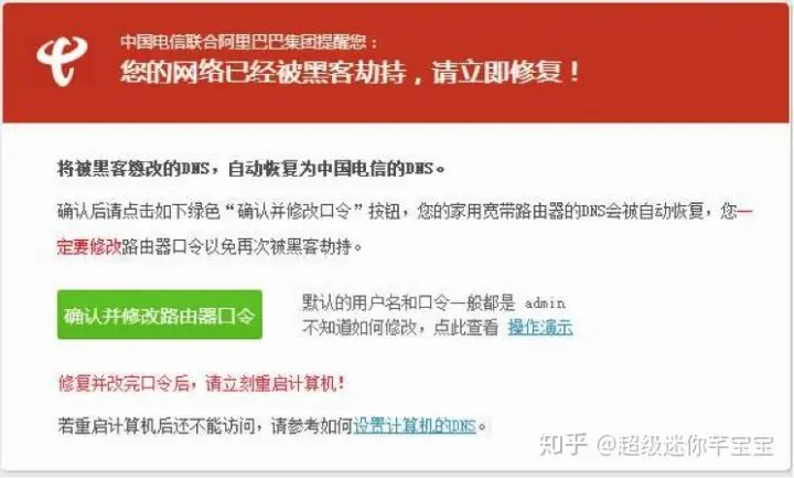 接下来,我们再来看看DNS劫持对DNS服务器会造成哪些威胁。DNS劫持是指攻击者在劫持的网络范围内拦截域名解析的请求,篡改了某个域名的解析结果。比如用户本来想访问www.aliyun.com,却被指引到了另一个假冒的地址上,从而达到非法窃取用户信息或其他不正常的网络服务的目的。对用户而言,DNS劫持是很难感知的,因此造成的影响极大。如2013年就爆发过一次大型的DNS钓鱼攻击事件,导致约800万用户感染。攻击者通常会通过两种方式实现DNS劫持,一种是直接攻击域名注册商或者域名站点获取控制域名的账户口令,这样可以修改域名对应的IP地址,另外一种方式是攻击权威名称服务器,直接修改区域文件内的资源记录。如下图,中国电信发现域名劫持时,给访问用户的提醒。