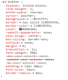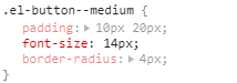 非常简单,这个方法将传入的四个参数分别设置了的padding、font-size、border-radius以及在加上了另一个子选择器is-round并对应设置其padding,这边应该是用于圆角按钮的实现,跳过。至此一个el-button--medium选择器设置完毕。如图。