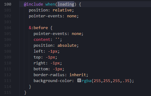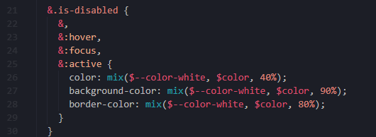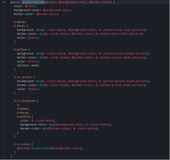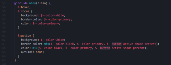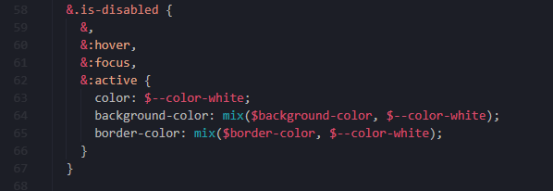 看下来是正常的设置几个样式以及各种状态的样式,其中的常量基本都在var.scss中定义,值得提的几个点,mix()是scss中的方法用于按照百分比混合颜色,后面三个css分别为