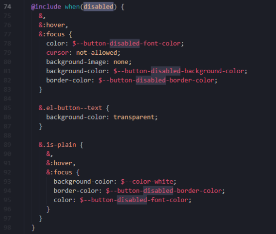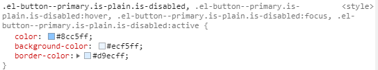 根据之前的when()该方法创建了一个.el-button.is-disabled的选择器,并且将下面的样式赋值进去最后结果为