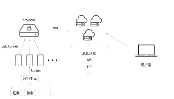 基本和openSTF类似,mini作为provider,provider去管理手机和处理与云端服务器之间的消息,连接到云端服务器,云端服务器能够支持N个provider接入,并且自身能很容易地去做扩展,而云端服务器则负责分发消息,与做一些websocket服务的代理转发,前端则直接对接云端服务器。