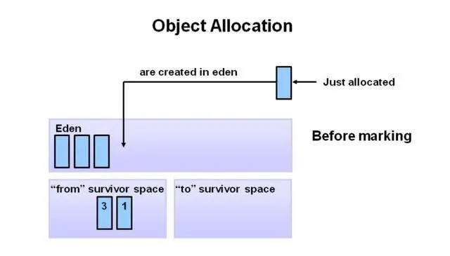 现在你已经理解了为什么堆被分成不同的代,现在是时候看看这些空间是如何相互作用的。后面的图片将介绍JVM中的对象分配和老化过程。