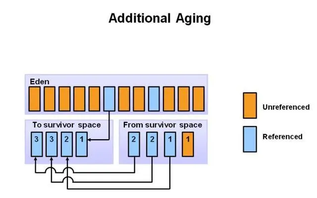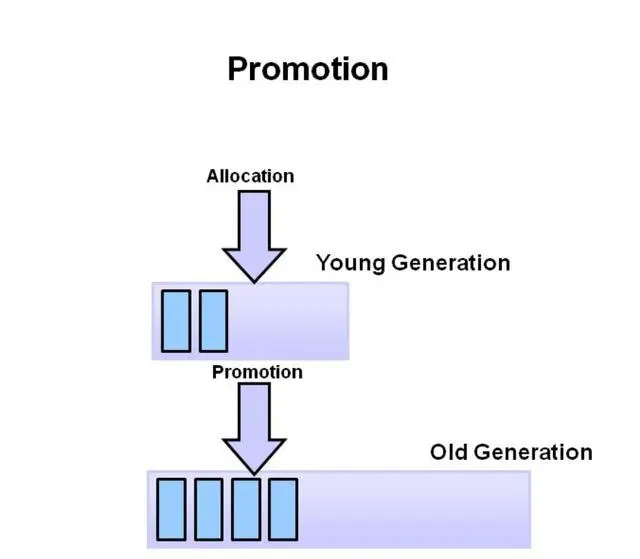 此幻灯片演示了 promotion。在较小的GC之后,当老化的物体达到一定的年龄阈值(在该示例中为8)时,它们从年轻一代晋升到老一代。
