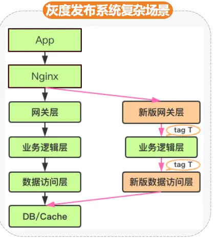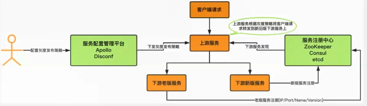 - 上游服务介入客户端请求,根据下发的灰度配置将符合条件的请求转发到下游新旧版服务上。