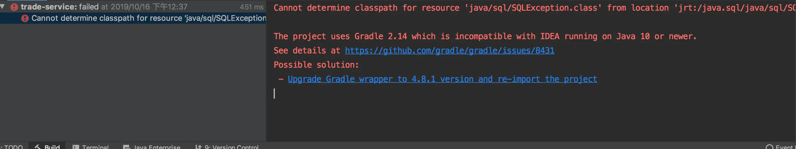 一时心血来潮把idea从2017升级到了最新的2019.2版本,刚开始都还好,升级丝般顺滑.但是导入项目之后出现gradle的报错 如下: