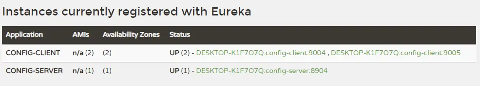 - 我们先启动相关服务,启动eureka-server,以application-amqp.yml为配置启动config-server,以bootstrap-amqp1.yml为配置启动config-client,以bootstrap-amqp2.yml为配置再启动一个config-client,启动后注册中心显示如下: