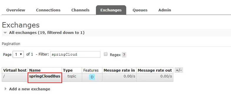 - 启动所有服务后,我们登录RabbitMQ的控制台可以发现Spring Cloud Bus 创建了一个叫springCloudBus的交换机及三个以 springCloudBus.anonymous开头的队列: