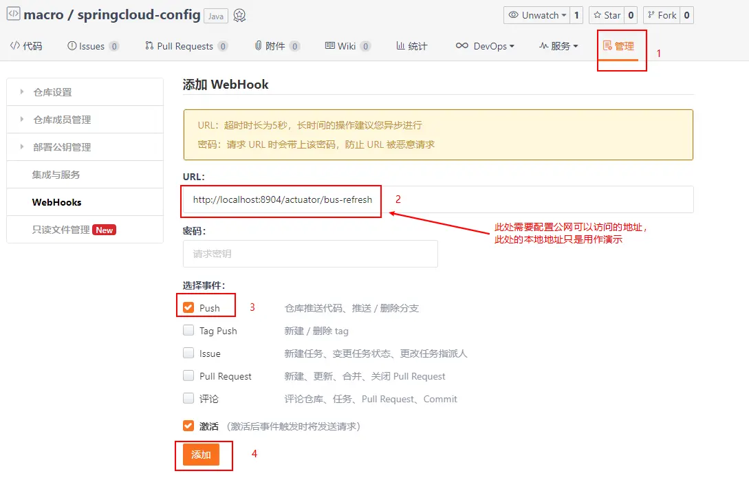 WebHooks相当于是一个钩子函数,我们可以配置当向Git仓库push代码时触发这个钩子函数,这里以Gitee为例来介绍下其使用方式,这里当我们向配置仓库push代码时就会自动刷新服务配置了。