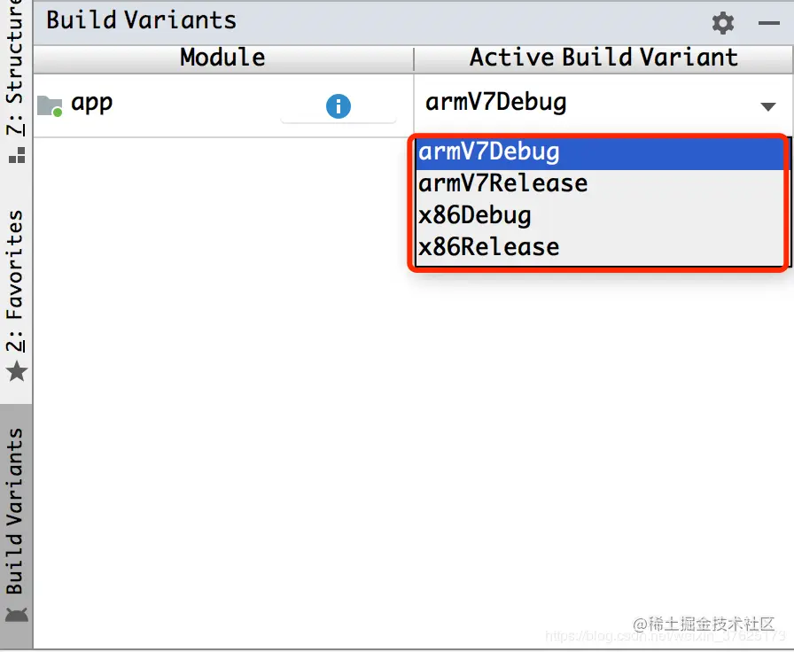 因为 “x86” 和 “armV7” 两个风味各自都默认有 “release” 和 “debug” 两种编译类型,所以 2x2 则有 四种变体。