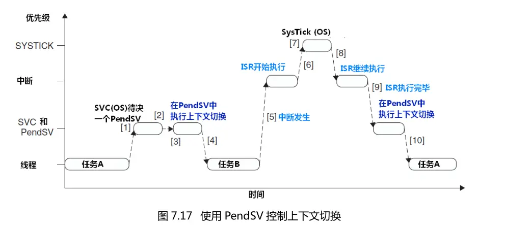 PendSV 异常会自动延迟上下文切换的请求,直到其它的 ISR 都完成了处理后才放行。为实现这个机制,需要把 PendSV 编程为最低优先级的异常。如果 OS 检测到某 ISR 正在活动,它将悬起一个 PendSV 异常,以便缓期执行上下文切换。也就是说,只要将PendSV的优先级设为最低的,systick即使是打断了IRQ,它也不会马上进行上下文切换,而是等到ISR执行完,PendSV 服务例程才开始执行,并且在里面执行上下文切换。过程如图所示:然后获取