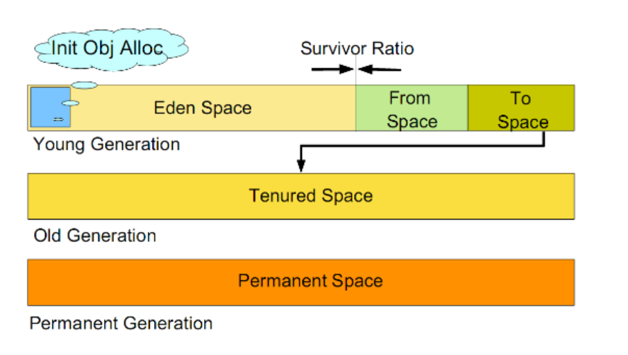 - Yong Generation 即年轻代内存,又可以分成eden/s0/s1三种,其后2者也被称之为“from space”和“to space”。所有新生成的对象首先都是放在年轻代的。年轻代的目标就是尽可能快速的收集掉那些生命周期短的对象