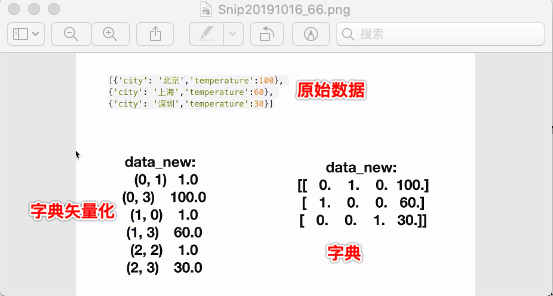 啥是字典特征抽取呢,就是把数据集中那些类型是特征的变成算法能处理的 One-Hot 编码,sklearn 提供了响应的 API:sklearn.feature_extraction.dict_vectorizer
