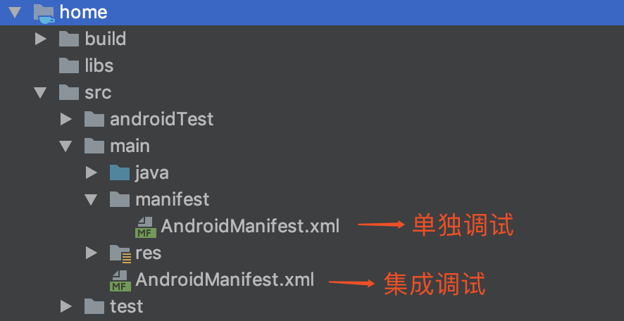 // 1.单独调试与集成调试时使用不同的 AndroidManifest.xml 文件