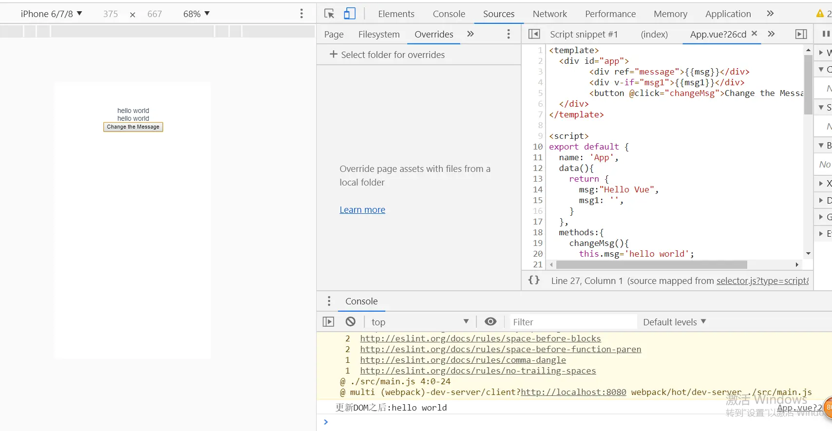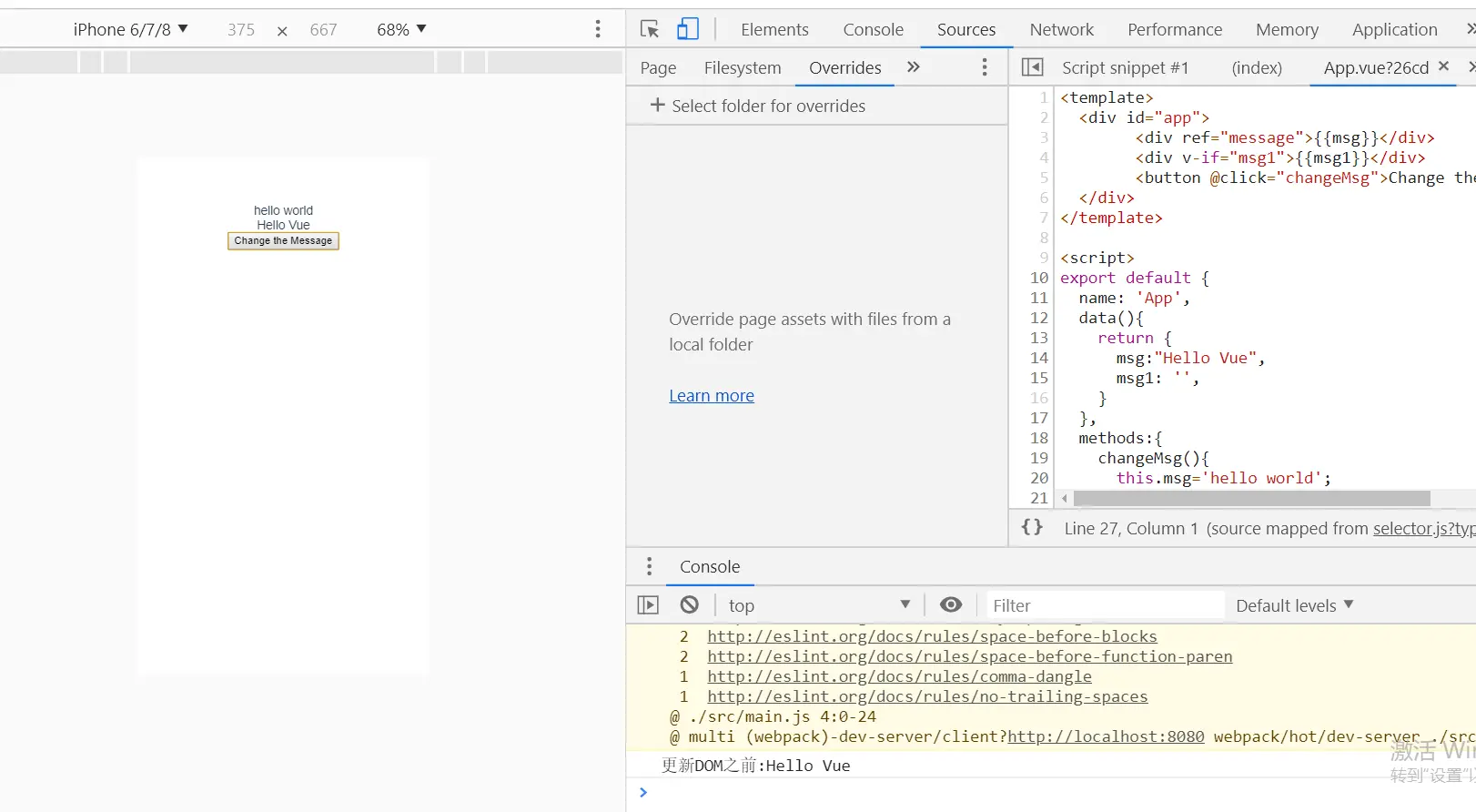 </style>我们通过运行代码能够看到当我们不在this.$nextTick方法里面进行DOM操作的时候,this.$refs.message.innerHTML的值存储的还是之前的初始值;