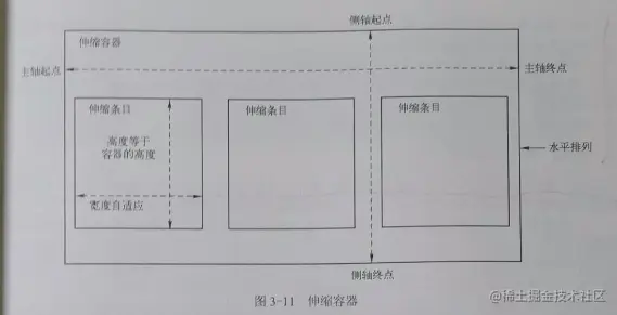 每个伸缩容器都包含两个轴,主轴(main axis)和侧轴 (cross axis).元素可分别在主轴和侧轴上对齐。