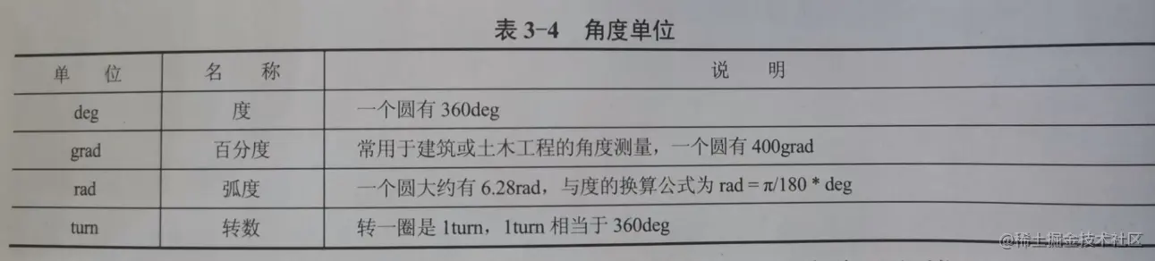 角度和时间都是CSS3新增的单位,角度用于旋转(rotate),时间用于过渡(transition)和动画(animation).