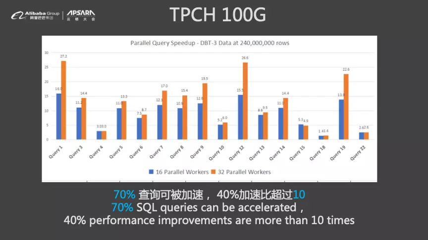 那么,并行查询的效果如何呢?在TPCH 100G数据量的情况下,使用POLARDB并行查询时发现70%的查询可以被加速,40%的加速比超过10倍,几乎能够将CPU能力完全发挥出来。