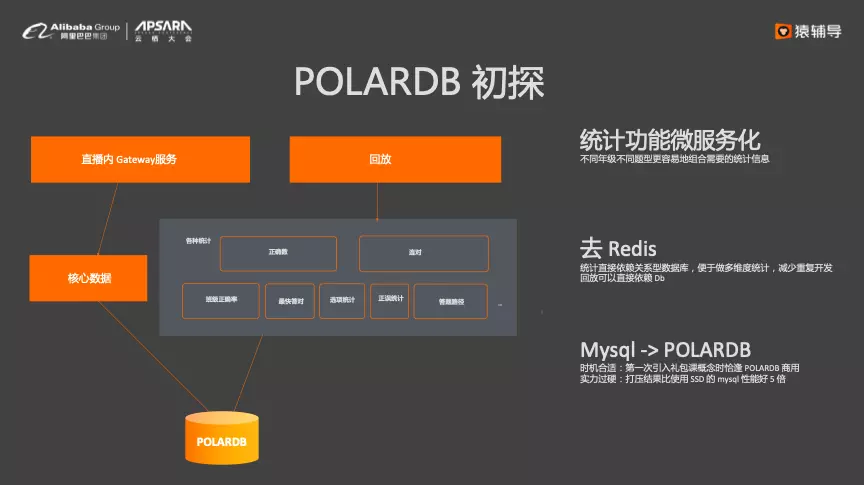 猿辅导最初使用MySQL + Redis方案,MySQL落盘核心数据并提供回放服务,Redis则实现各种榜单供直播使用。这种方案的问题是Redis数据无法复用,导致写多份,并且单机MySQL存在性能瓶颈无法支持更高的QPS。后来猿辅导就引入了POLARDB数据库,并将统计功能进行了微服务化,去掉了Redis。