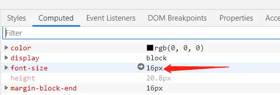 在浏览器中观察,不会看见显式的报错,但 font-size 的最终解析值仍是默认的 16px。
