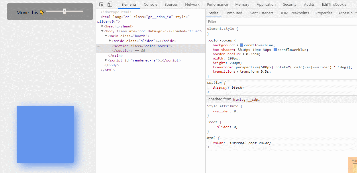 实现原理是这样的:我们在拖拉 Range Input 的时候,获取当前的 value 值,设置为变量 --slider 的值,.color-boxes 使用了此变量设置自身的 Y 轴偏移度。