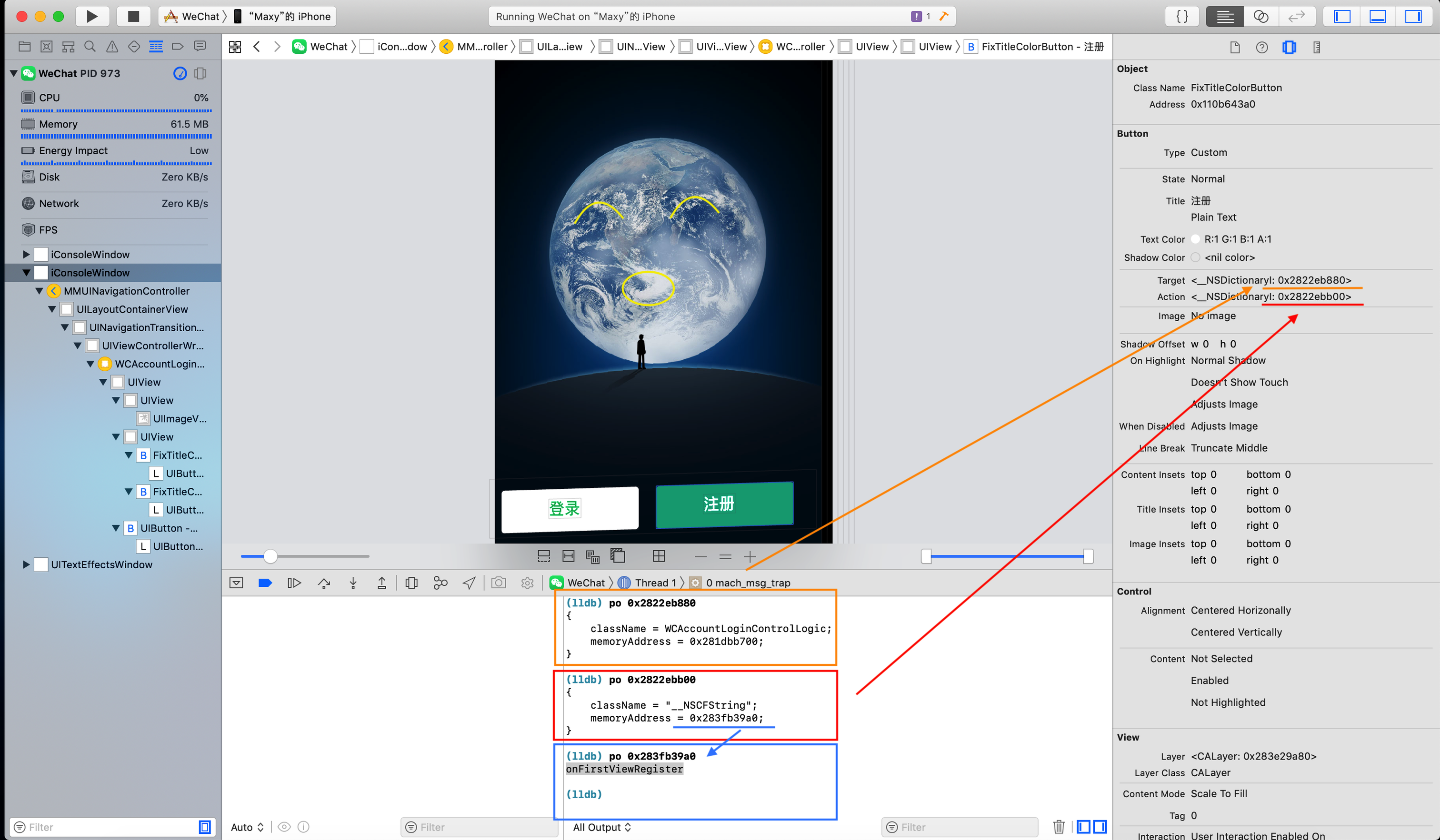 5、如下图所示,因为Xcode版本不同,有的Target 和 Action 会直接显示类名,如果不直接显示类名的,可以用po命令+对象地址看到ClassName。p是执行指令,o是object的意思。