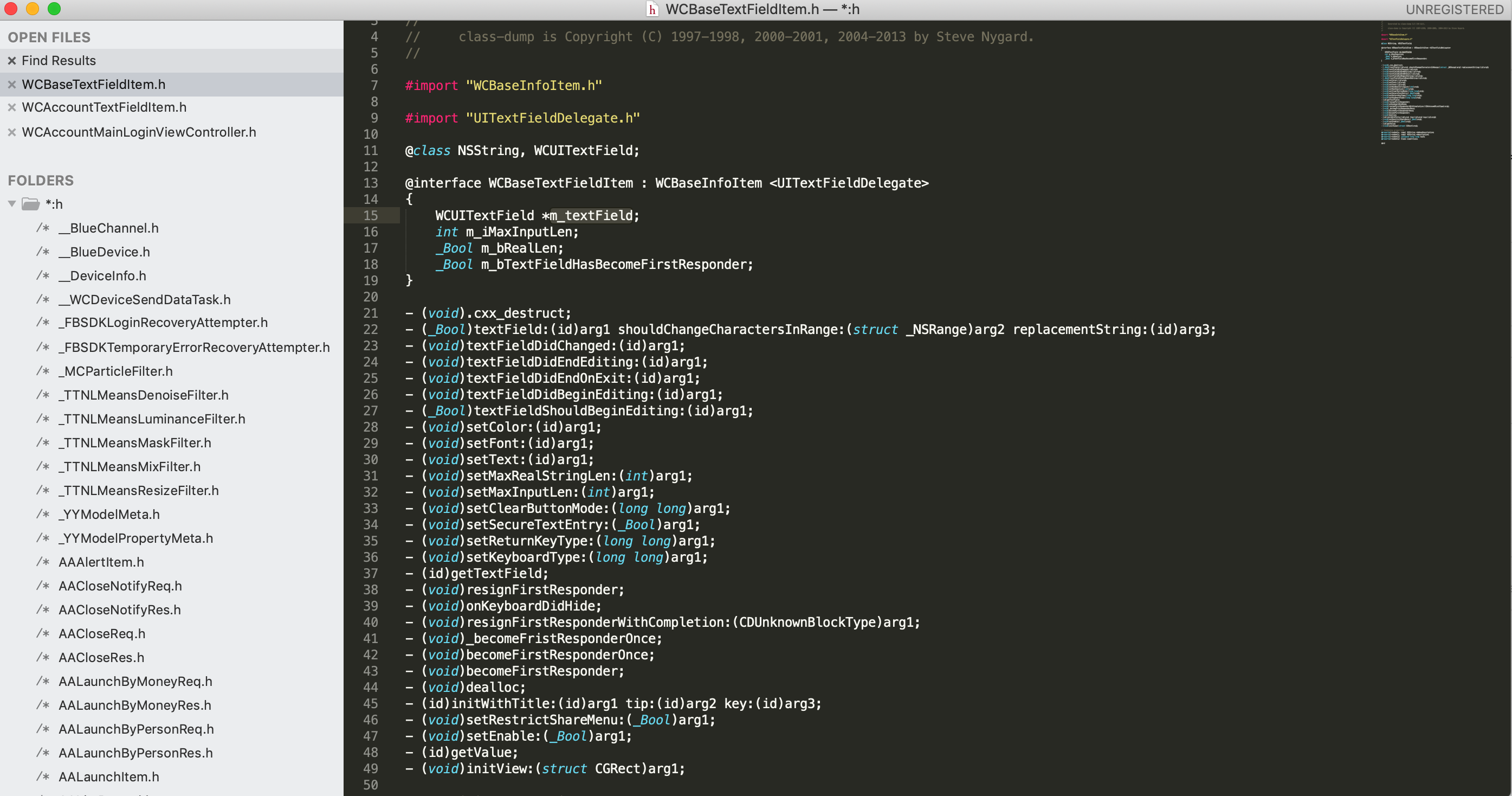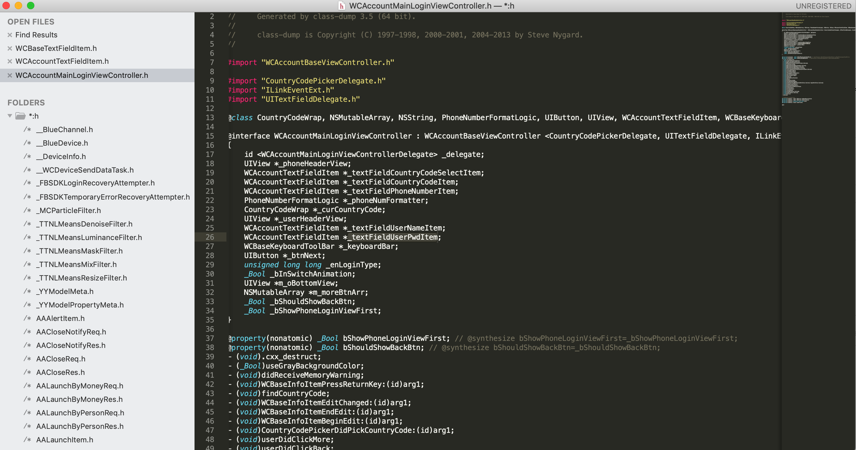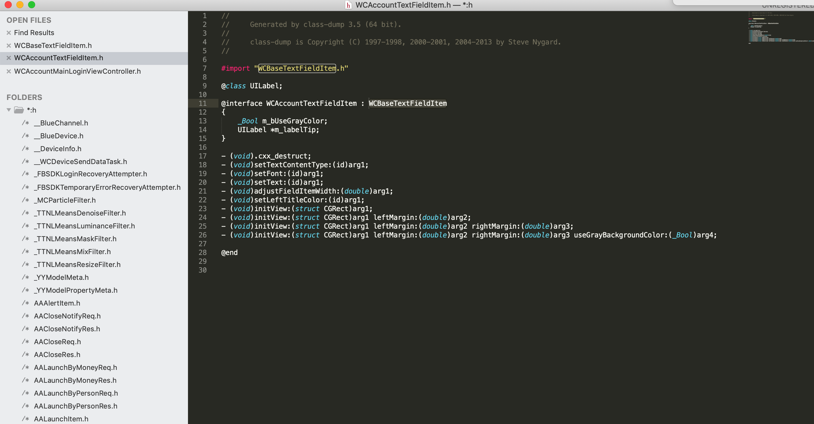 class-dump -H 二进制文件 -o 目标文件夹7、根据clas-dump导出的文件,考虑相关逻辑。关于查看class-dump导出的文件,建议使用轻量级的sublime,使用更快速。