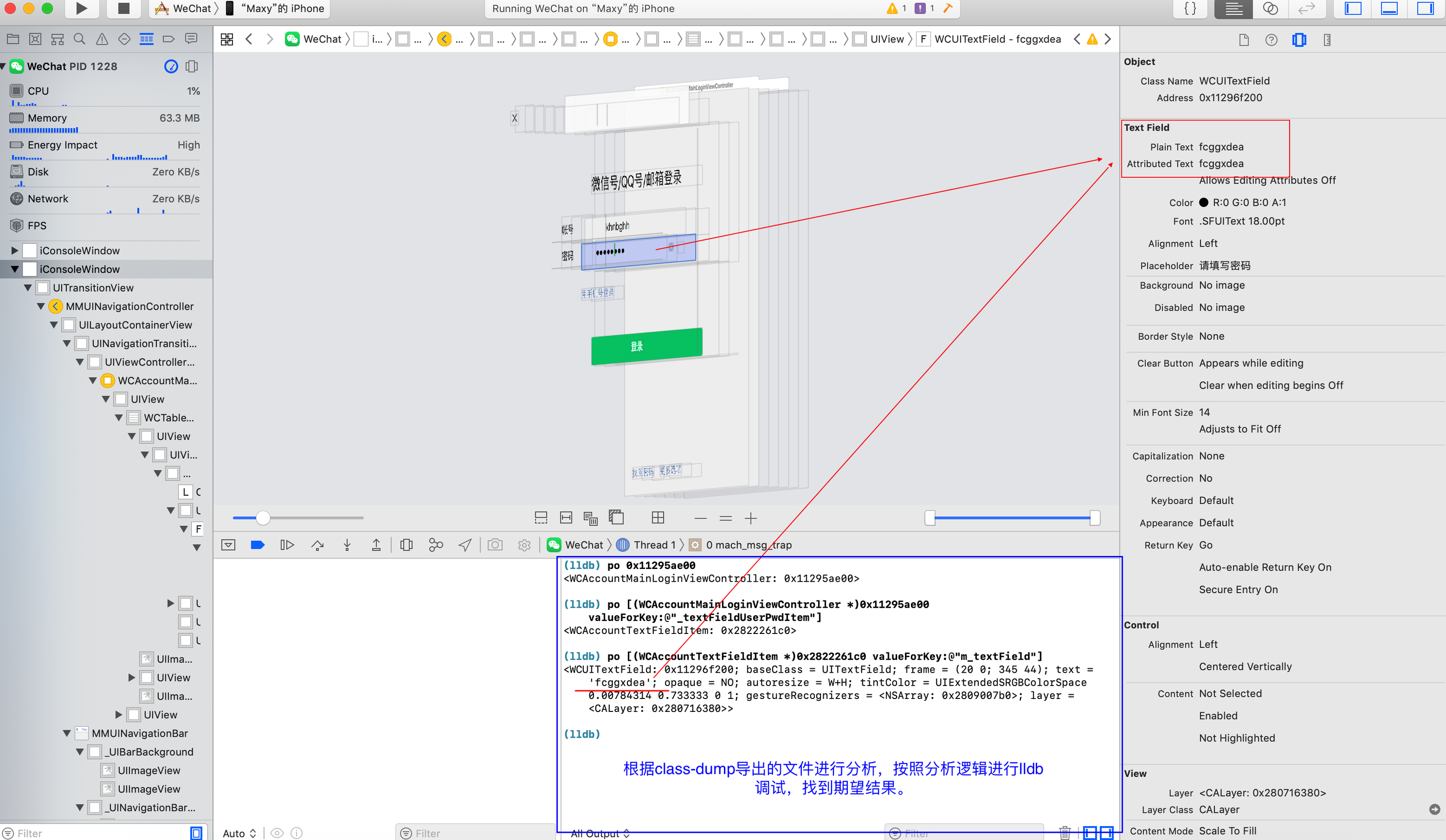 在WCBaseTextFieldItem下,查到WCUITextField *m_textField。以上仅是分析,但不能判断是否就是我们需要的UITextField,所以首先,我们要lldb调试。