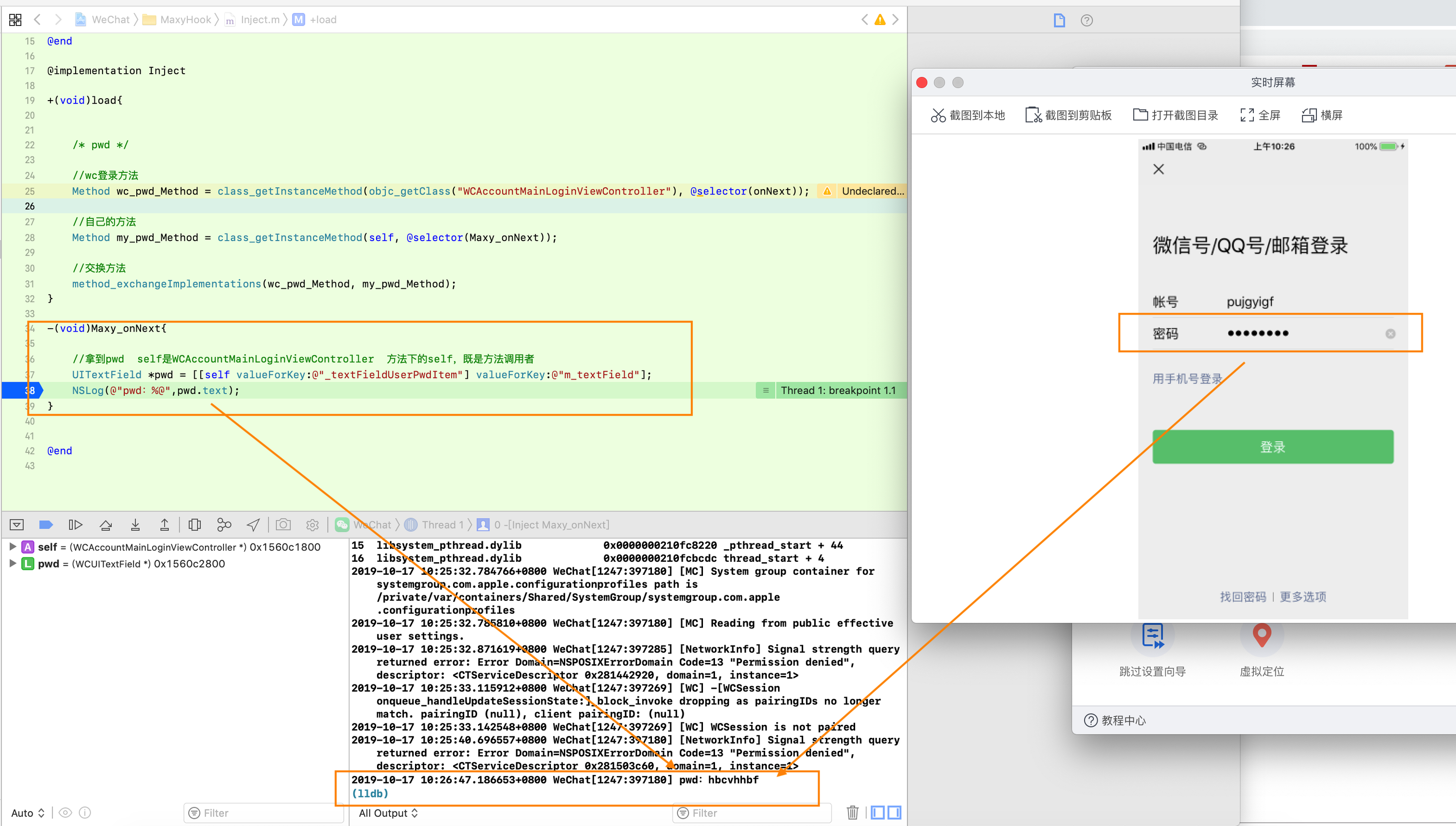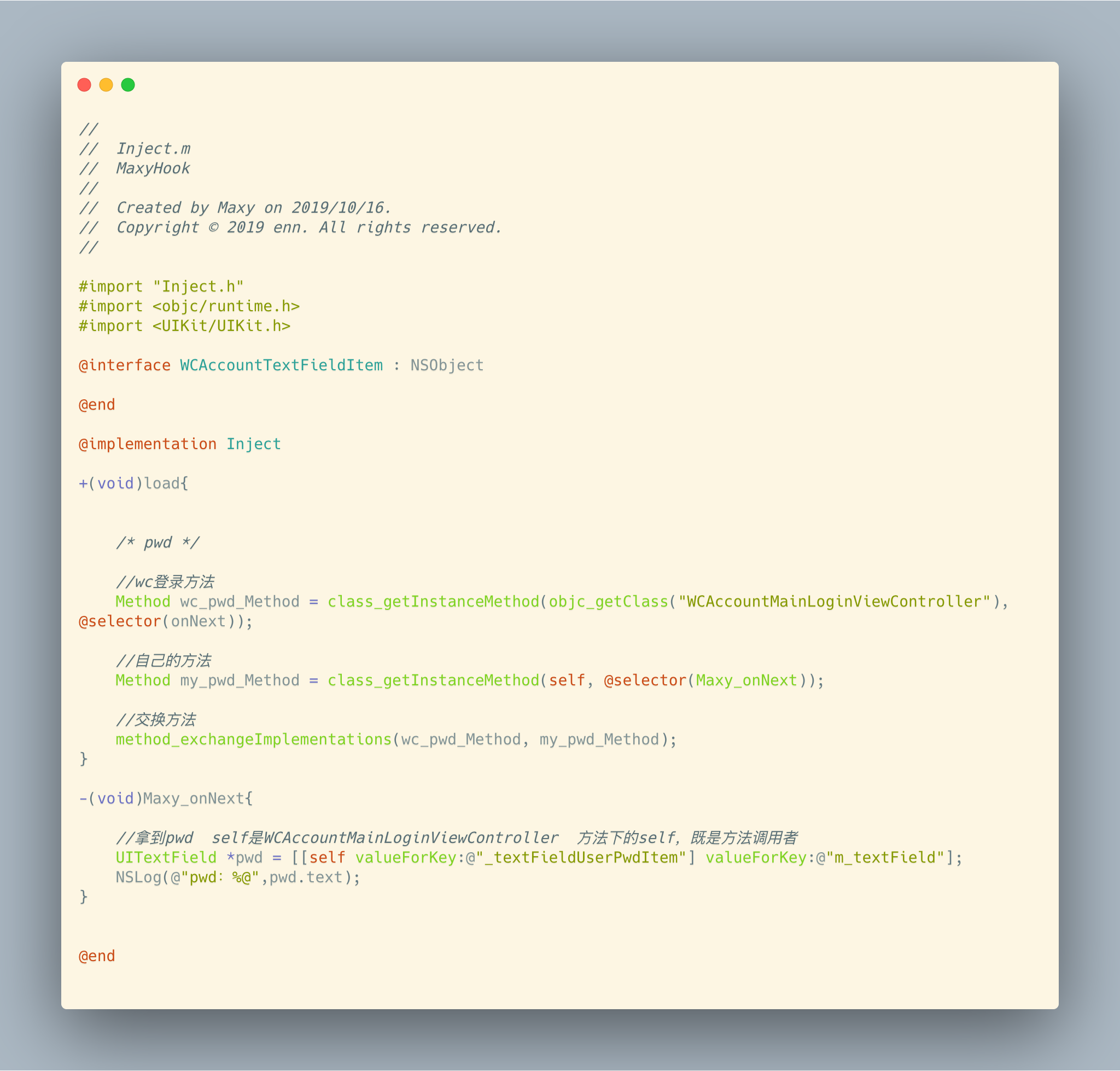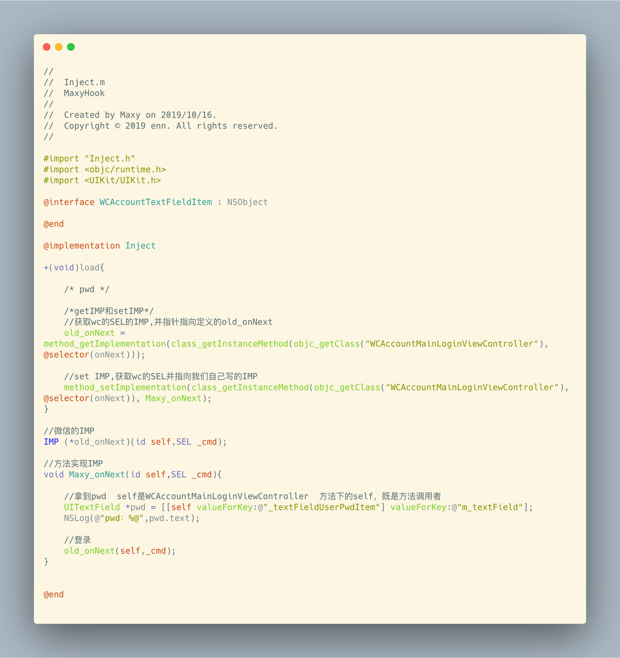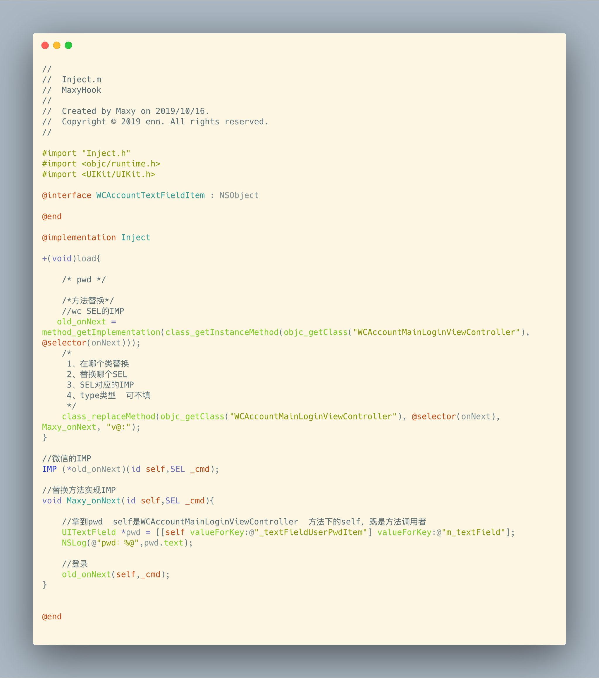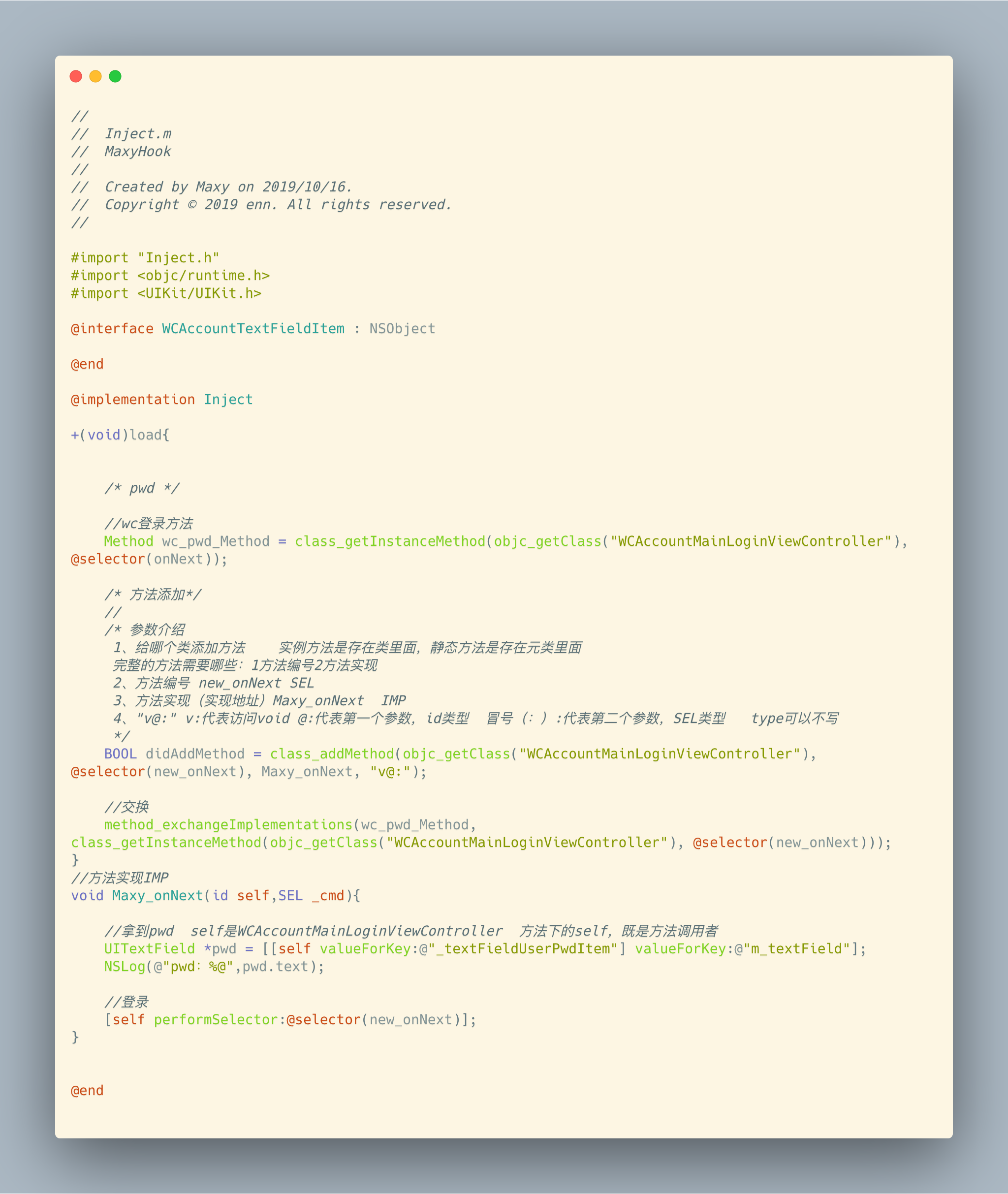 这是在inject类中增加新的方法,再实现方法交换,但WCAccountMainLoginViewController并不存在Maxy_onNext调用方法,要想真正的根据业务需求实现方法交换,需要给WCAccountMainLoginViewController增加新的方法,在inject实现方法交换。