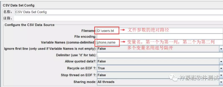 Sharing Mode:共享模式。All threads:所有线程,所有线程循环取值,线程1取第一行,线程2取下一行;Current thread group:当前线程组,各个线程组分别循环取值;Current thread:当前线程,该测试计划内的所有线程都取第一行。