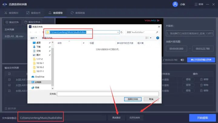 3、设置好提取的片段范围后修改视频转换成mp3格式的文件保存路径,修改时需要点击下方的更改路径按钮去选择输出的路径,要确定保存路径有没有设置正确可以点击打开文件夹按钮进行确认。