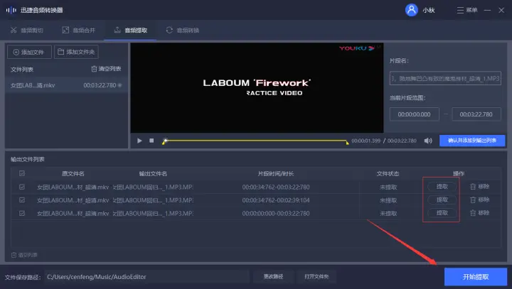 4、以上参数都调整好后可以依次点击提取按钮依次转换格式,也可以直接点击开始提取按钮把视频从上往下统一转换成mp3音频格式。