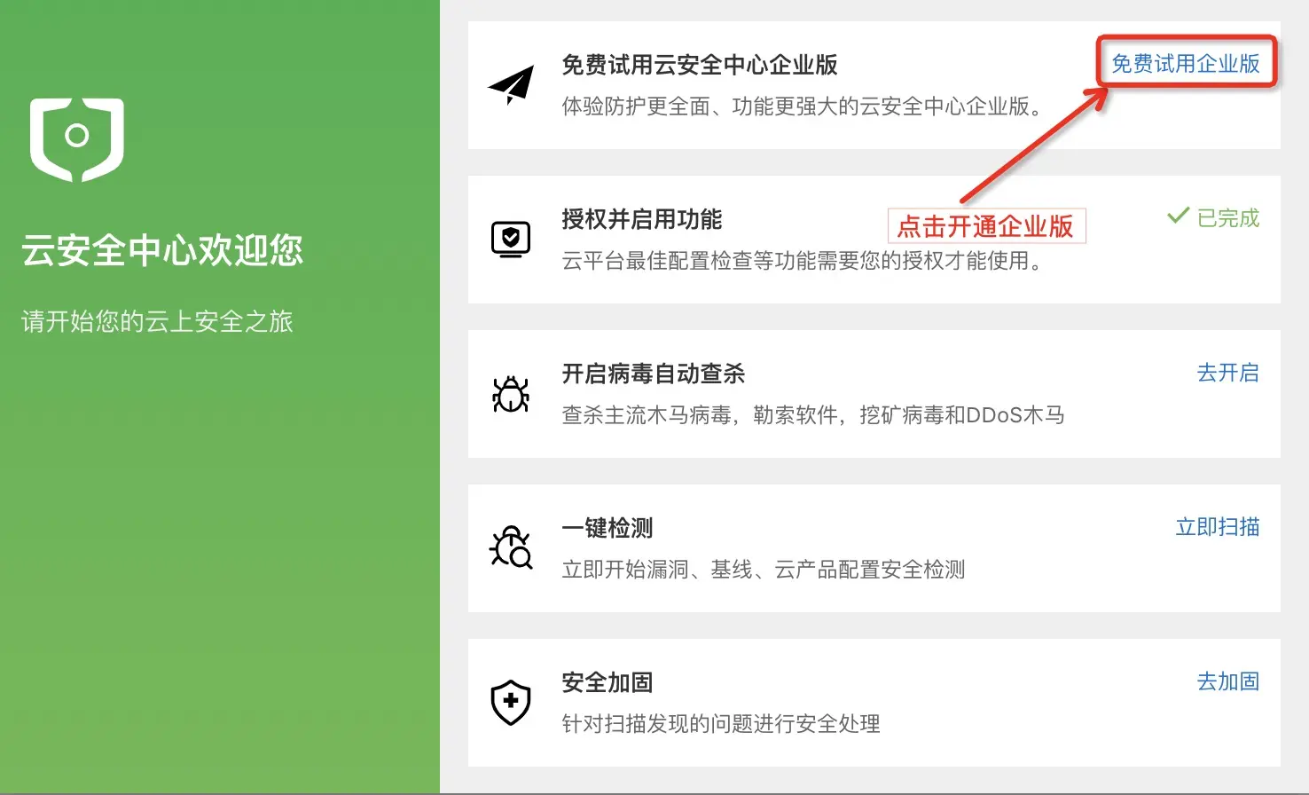 云安全中心已提供免费7天试用服务,登陆控制台开启企业版试用功能,利用漏洞修复、基线检查、安全告警功能对系统做深度检查,及时修复当前存在的安全隐患。