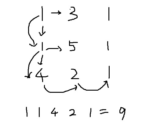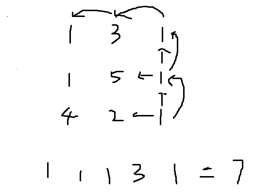 按照正常思维来看的话,人站在起点处,向右或向下走到终点,那么最短距离就是每次比较向左或向下的路程,取最小的走,在加上自身需要的路程,这样一直走到终点就是最短的路径值。对照着题目验证下,那就是 1 -> (向下) 1 -> (向下) 4 -> (向右) 2 -> (向右) 1 到达终点,总距离是 9 ,发现这种走法是错的。正确的走法应该是 1 -> 3 -> 1 -> 1 -> 1 ,总距离是 7 最短。