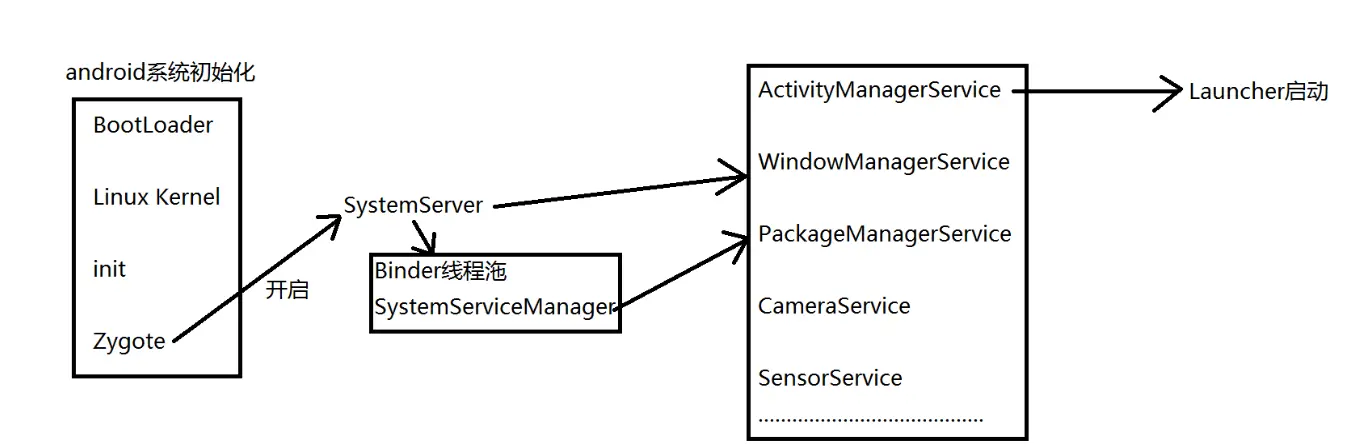 Android系统在按下电源键时 引导芯片的代码加载引导程序Boot Loader到RAM中去执行 ,BootLoader把操作系统拉起来 ,Linux 内核启动开始系统设置,找到一个init.rc文件启动初始化进程,init进程初始化和启动属性服务,之后开启Zygote进程,Zygote开始创建JVM并注册JNI方法,开启SystemServer,SystemService中有ServiceThread内部类在systemService初始化的main函数中会初始化这个线程,在线程中接下来会启动Binder线程池和SystemServiceManager,并启动各种服务,而且launcher的启动也是在设个run方法中调用ActivityManagerService的 systemReady,在设个方法中调用ActivityStack 的resumeTopActivityLocked ,之后的逻辑也就是APP的地洞流程 ,这样系统开机就完成,我们可以点击launcher 上的app图标去开启app