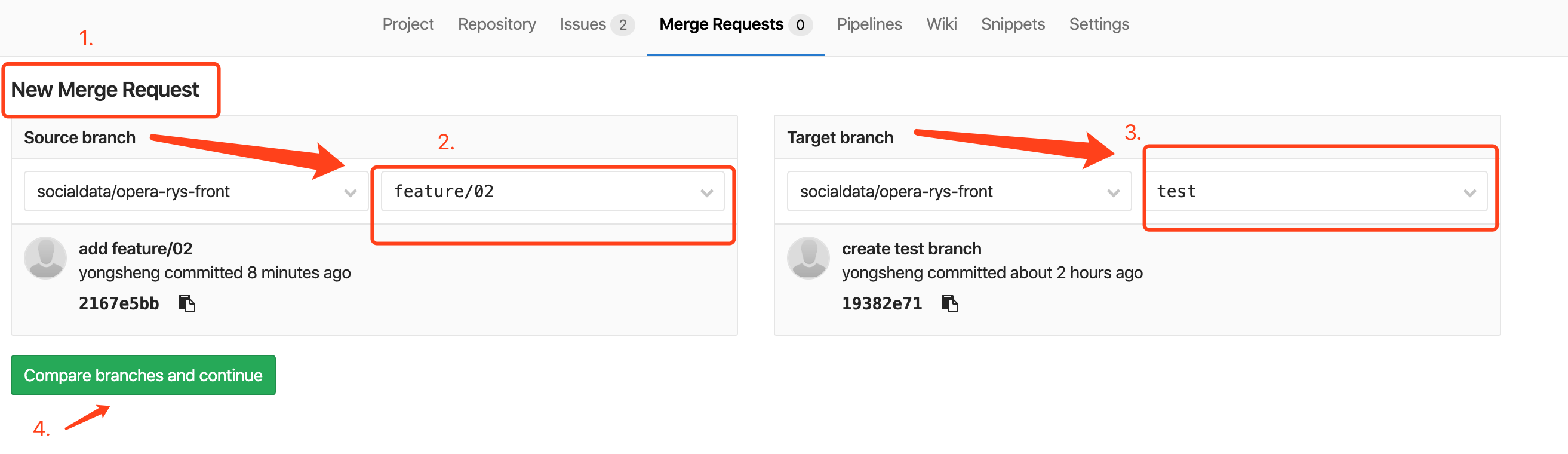- 去gitlab GUI上发 merge request,将 source branch ====merge===>>> target branch