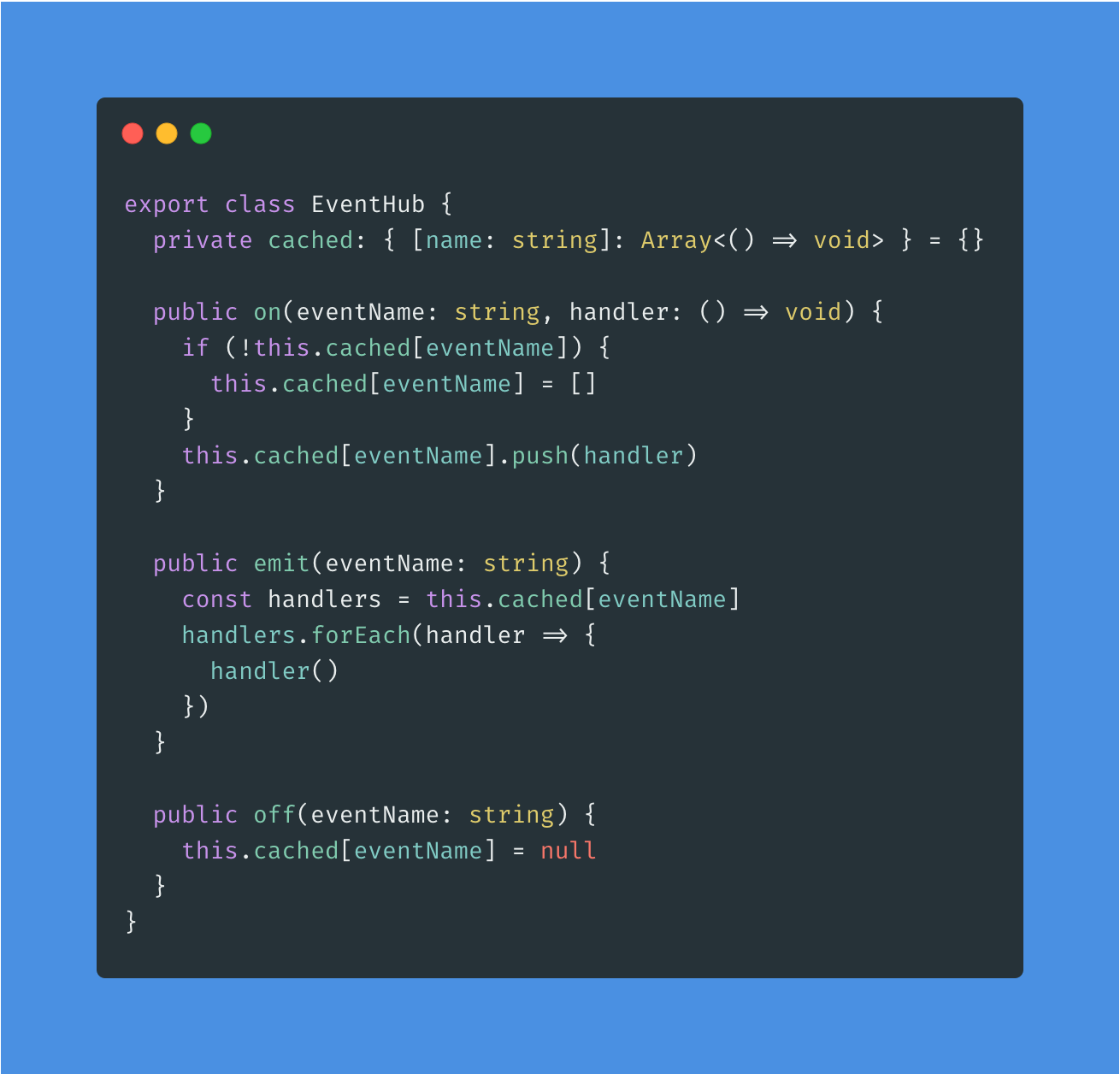 - 首先 eventHub 是模块之间进行传递的一种方式,采用发布订阅模式。关于概念好想也没啥说的。下一步就是找到 eventHub 需要实现的方法,分别是