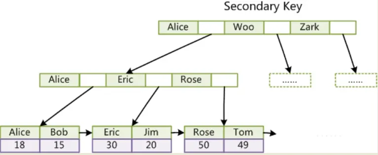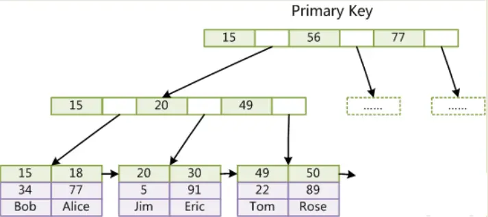 - 关键字全部存放在叶子节点中,而叶子节点中有一个指针指向一下个叶子节点。这样可以提高区间访问的性能(范围查询)。