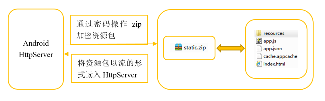 在加载的时候,以流的形式读入HttpServer。除了随apk发版的Web资源包是一个约定的密码,后续的Hotfix形式的资源包都是动态密码下发,即密码在资源包之前下发。之所以不选择与资源包一起下发,是降低密码与资源包一起被截获的可能,虽然这里的密码传输也使用了前面所述的加密。