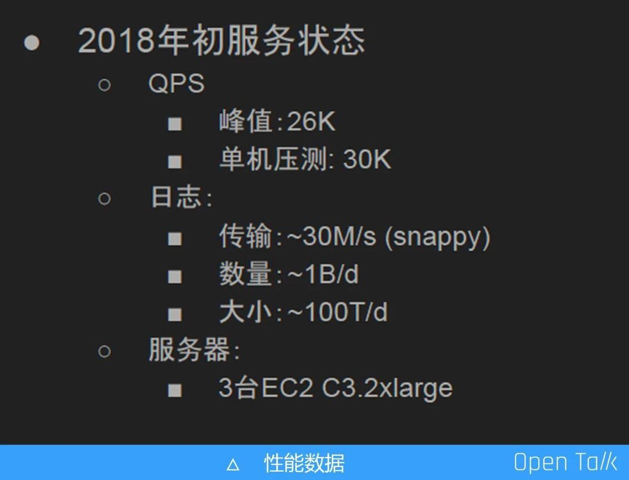 2018 年初我做了统计,QPS 峰值大概是 26000QPS,单机压测的峰值在 30000QPS,所以其实一台 OpenResty 的机器可以抗住整个埋点的流量。日志传输压缩之后大概有 30M,每天的日志落起来大概在 10 亿条左右。为了保证服务的可靠性,当时线上的服务器是三台 EC2 C3.2xlarg。
