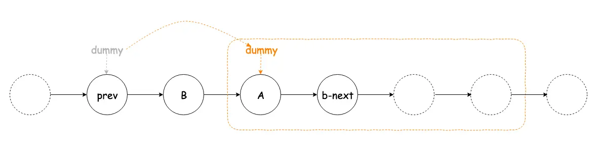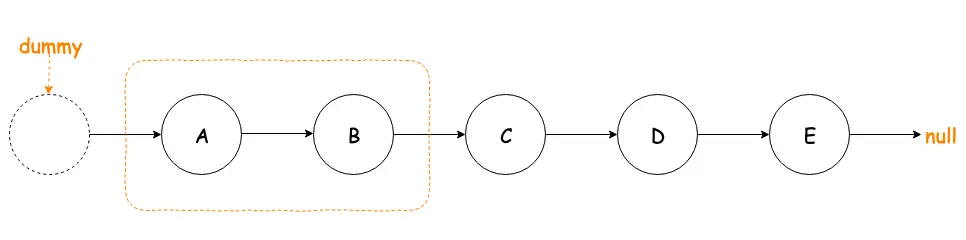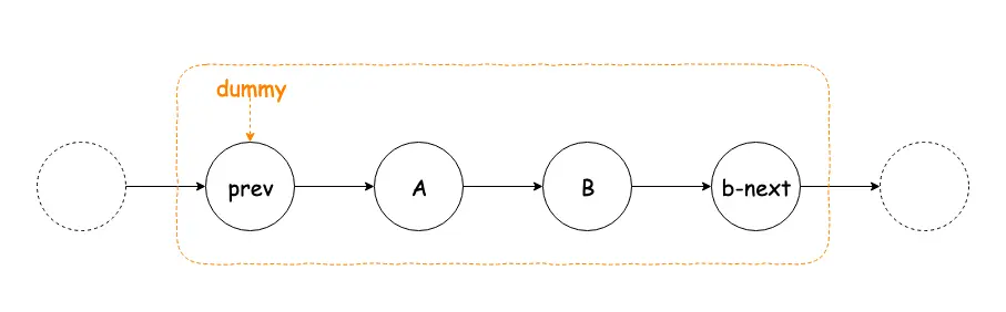 在这个步骤中,我们在操作 4 个结点的指针,但是其实每次初始的结点,只有 A 的前驱结点 prev 结点。为了保证循环内的操作一致,我们可以在链表前,加一个虚拟的头结点,来辅助我们,让代码更简洁。