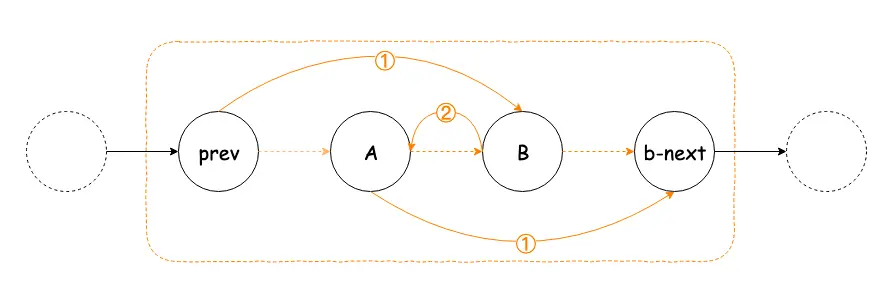 如图所示,步骤 ① 操作有两步操作,因为其操作的指针互不影响,所以在写代码的时候不分先后,在保证 prev 指针和 b-next 指针的指向无错后,就可以开始 A、B 结点的反转,也就是步骤 ②。