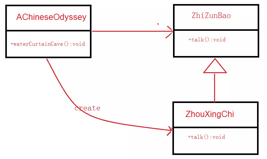 从上图可以看出,AChineseOdyssey类同时依赖于ZhiZunBao接口和ZhouXingChi类,并没有达到我们所期望的剧本仅依赖于角色的目的。但是角色最终必须通过具体的演员才能完成拍摄,如何让ZhouXingChi和剧本无关而又能完成ZhiZunBao的具体动作呢?当然是在影片拍摄时,导演将ZhouXingChi安排在ZhiZunBao的角色上,导演负责剧本、角色、饰演者三者的协调控制,如下图: