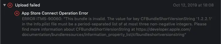 进入一看,果然发现了问题,info.plist中的CFBundleShortVersionString是1.2.2.1 (忍不住吐槽一下,这么设置版本号真是坑人没商量啊),将版本号修改为不超过三段式的就可以了。