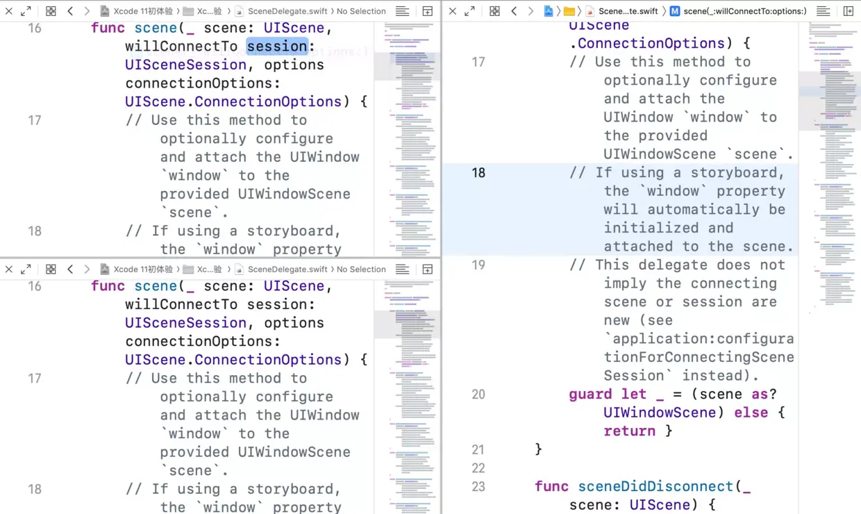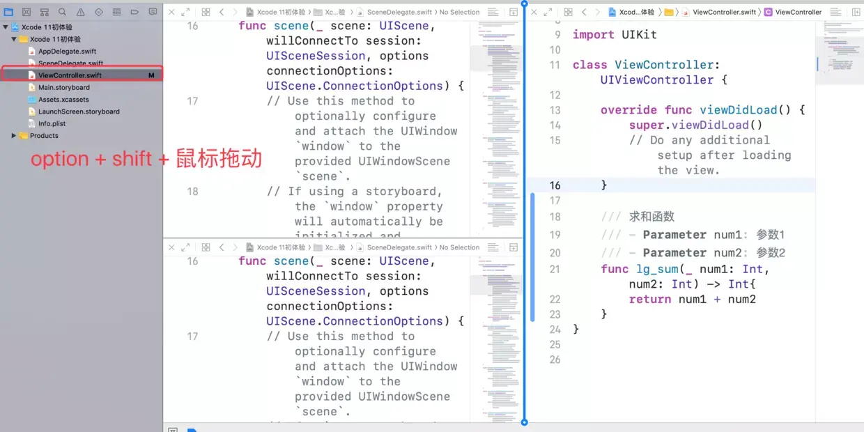 上面我们介绍了窗口分割,在 Xcode 11 中,你还可以按住 Option + Shift,然后在左边点击要打开的文件,这时会出现窗口选择提示