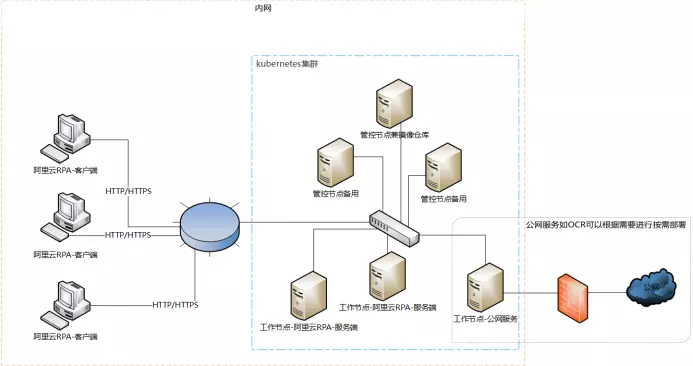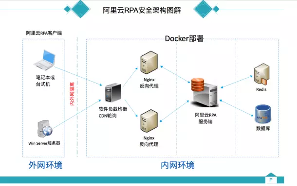 在部署上阿里云RPA提供了行业领先的阿里云Docker部署方式,客户端可以访问外网环境,但负载均衡器、nginx反向代理器、数据库等部署在内网环境,应用程序加密存储在数据库中,将内外网访问隔离,大大提高了系统的安全性。