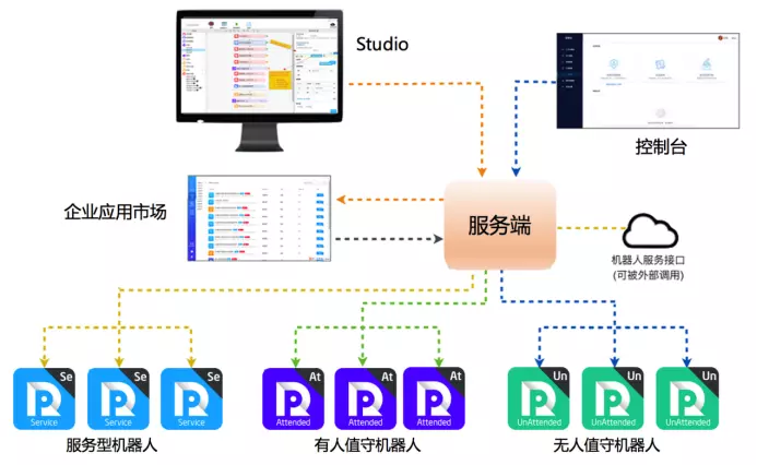 ● 服务型机器人:当A软件与B软件之间需要进行打通数据等软件交互行为操作的时候,A软件可以通过接口的形式触发服务型机器人到B软件自动化操作,让服务型机器人执行的结果通过接口的形式返回回来;尤其是在跨系统、跨平台的自动化操作的时候,可采用服务型机器人,目前本地化部署/云端部署均有实践案例;