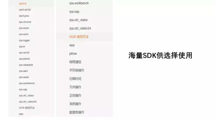 产品根据国内众多企业办公的实际需求,既具备Microsoft Office自动化能力,又具备WPS办公软件的自动化能力,此外在IE/chrome/数据库/SAP/WIN32等环境丰富了也增加了各类SDK,令自动化开发者仅需简单的代码指令即可执行复杂的操作,进一步降低开发成本和学习成本。